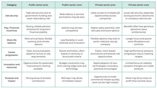 - Work-life balance: Many private sector roles demand longer hours, which can lead to a poorer work-life balance compared to public sector positions.