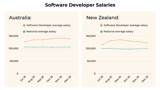 The three tech roles with the highest number of job listings across Australia and New Zealand on Adzuna from the last three months - along with their average salaries - are as follows: