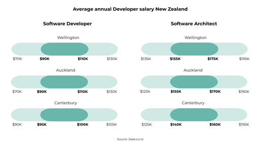 A more senior position, like a Software Architect, has an average salary of $185,000AUD | $155,000NZD going over $220,000AUD for roles in Melbourne and over $180,000NZD in Christchurch.