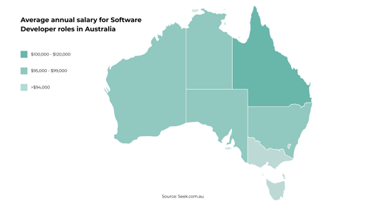 There are currently 1,999 Software Developer jobs live on Seek across New Zealand and Australia with a predicted 27% growth expected over the next 5 years. A Software Developer is looking to take home $95,000AUD | $100,000NZD on average with it going over $110,000AUD in areas of Queensland and over $125,000NZD in areas of Auckland.