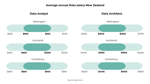 More senior positions as you progress in your data career, such as Data Architect take home an average salary of $160,000AUD | $160,000NZD reaching as high as $200,000AUD in New South Wales and $185,000NZD in Auckland. The higher pay grade also comes with increased demand with a predicted 27% job growth in the next five years.