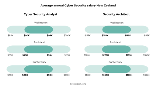 More senior roles like Security Architect take home an average of $165,00AUD | $175,000NZD with it reaching as high as $245,000AUD in areas like Victoria and $185,000NZD in Auckland. Wondering if there is enough demand as you work your way up the ladder? Seek currently has 2,490 live Security Architect roles across New Zealand and Australia.