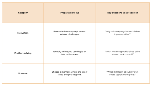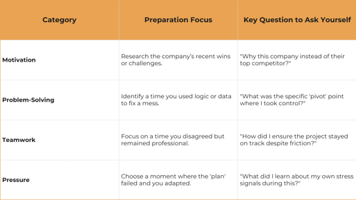 Here is how to strategically prepare for the four "pillars" of common interview questions: