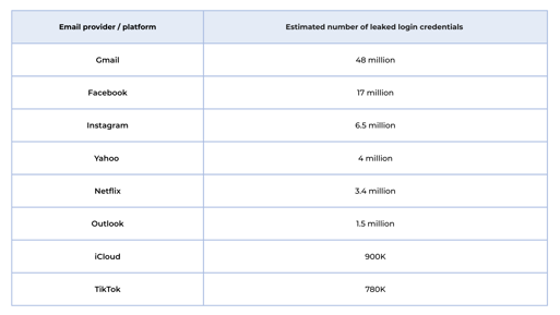Inside the dataset were login credentials for a variety of platforms, with the biggest hitter, Gmail, having a massive 48 million accounts compromised.